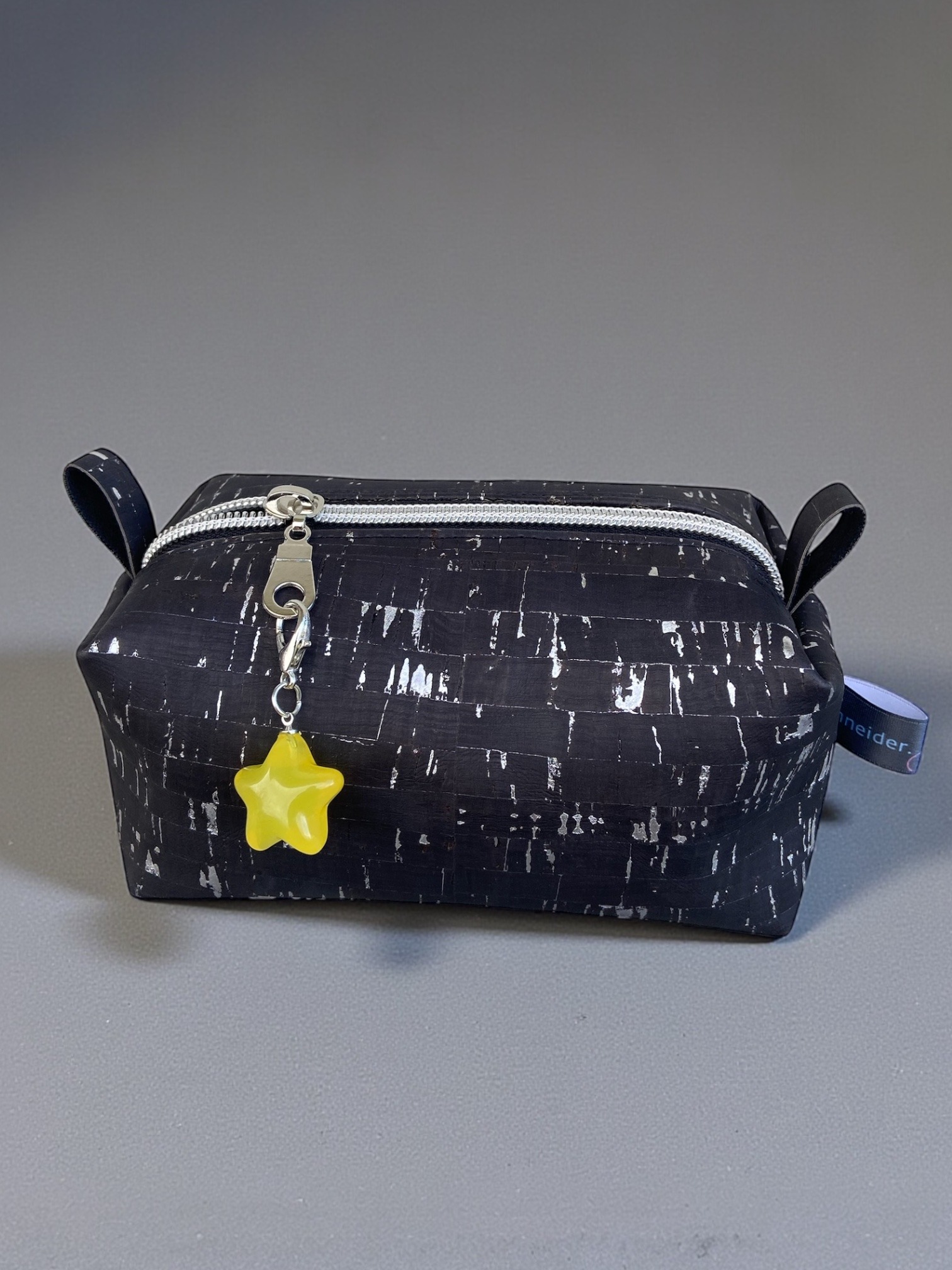Aussenstoff Korkstoff, Innenfutter Baumwolle grau mit weissen Tüpfli, Grösse: 15x7x7cm., Charm am Reissverschluss, Artikel nicht in der Maschine waschen.