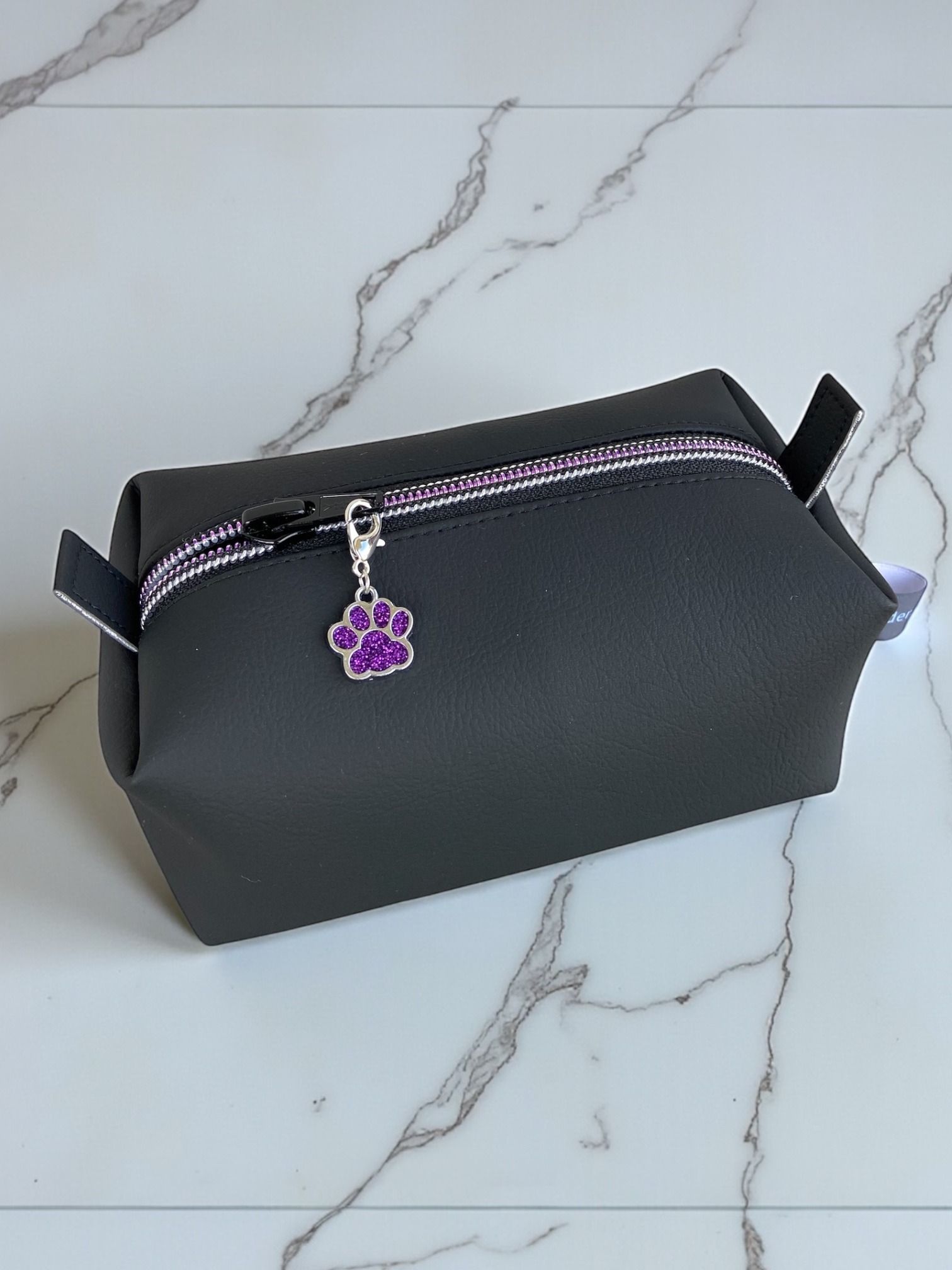 Aussenstoff Kunstleder, Innenfutter Baumwolle geblümt passend zu violetten Details, Grösse: 15x7x7cm., Charm am Reissverschluss, Artikel nicht in der Maschine waschen.